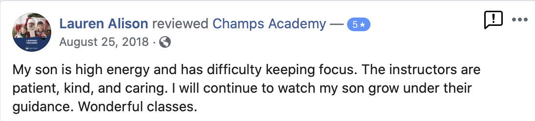 My son is high energy and has difficulty keeping focus. The instructors are patient, kind and caring.